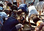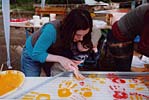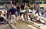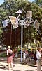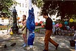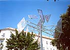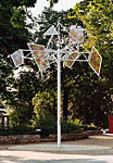 Die Grundidee einer Windskulptur für das Wohngebiet Helmholtzplatz zielte auf die Schaffung einer optisch anspruchsvollen, kinetischen Großplastik mit starker Anbindung zum Standort und aktiver Einbeziehung der Anwohner und Nutzer. Es soll durch seine Setzung auf den umgebenden Raum aufmerksam machen und zum Ort zurückführen. In der Entwicklung der Idee suchte Kunert als erstes nach einem Symbol das die Bindung der Anwohner zu ihrem Lebensraum benennt, und als "Heimat-bindend" verstanden werden kann. Der Baum als Sinnbild wurde als Ausgangspunkt gewählt, und in der Verwendung eines Mastes als Stamm abstrahiert, um deren oberes Ende eine "Krone" aus 9 großen, horizontal sich im Wind drehenden Segeln angeordnet sind. ![]() ![]() ![]() ![]() Diese Segel wurden mit farbigen Handabdrücken der Anwohner, vor allem der den Spielplatz nutzender Kinder, bedruckt. Kurze Wortkommentare oder der Name des "Sich- Verewigenden" wurden den Farbhänden zugeordnet. Der Boden der Standfläche um den Mast wurde, einer Baumscheibe gleich, mit konzentrischen gegossenen Segmentplatten in einem 5 m Kreis betoniert. Im Juni 2002 Juni wurde in diese Bodenplatte Abdrücke der Füße der Anwohner in den noch feuchten Beton gedruckt. Die Initialen der Namen wurden dazugeschrieben. ![]() ![]() ![]() ![]() Die Übersetzung der Borkenschnitzerei, des Zeichen hinterlassenden Besuchers, aber auch die Einzigartigkeit des Hollywoodstars mit dem Handprint am Sunset Boulevard, soll hier zitiert werden. Die für Kinder wichtige Marke an der Messlatte, die Vergleichsmessung am Fußabdruck, geben Anreiz zur Wiederkehr und Stolz auf den Wachstumsfortschritt, der Untertitel Spurensuche findet hier seine größte Entsprechung. ![]() ![]() ![]() Die Skulptur im optischen Kreuzungsbereich zweier Straßen und dem zentralen Standort auf dem Platz wirkt durch seine ruhige Drehbewegung und der eleganten Formgebung. Bei näherer Betrachtung kann der Detailreichtum zum Verharren und studieren anregen. nach oben | Startseite: Installationen: Helmholtzplatz |